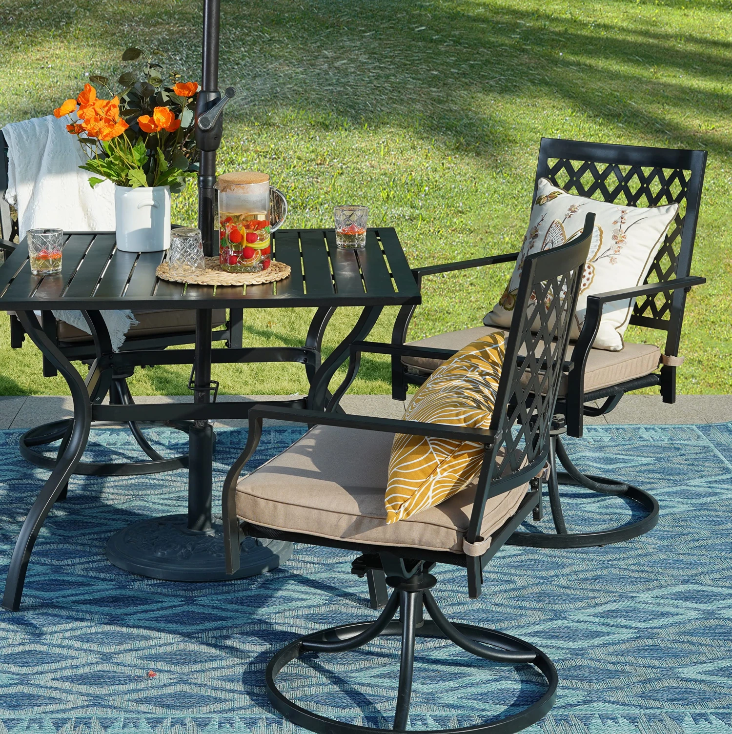 - Elegant modern design makes the table and chairs a perfect decoration for your house. 1.57″ umbrella hole fits most umbrellas and the bottom hole under the table helps to keep the umbrella stable.