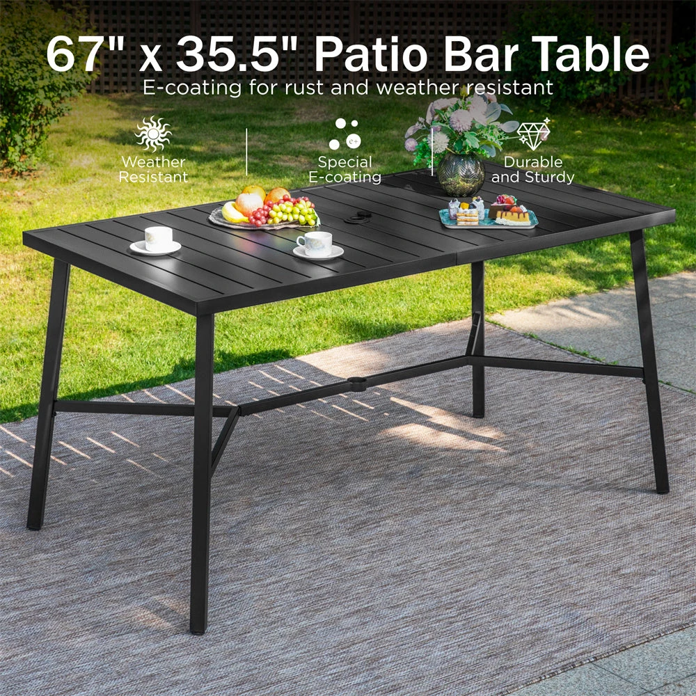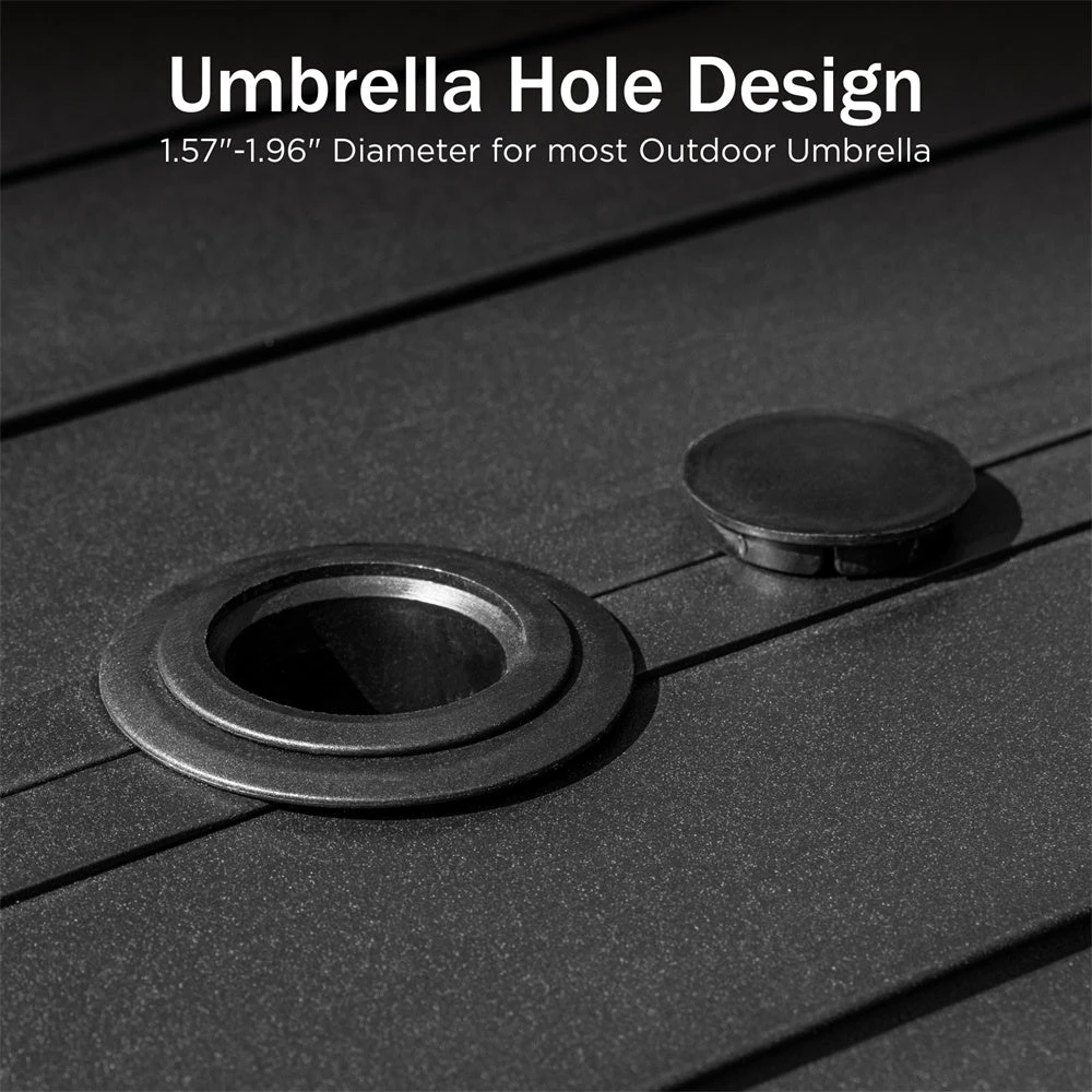 - Versatile Use: Powder e-coating metal slatted tabletop with 1.57″ umbrella hole for more choices on umbrellas.