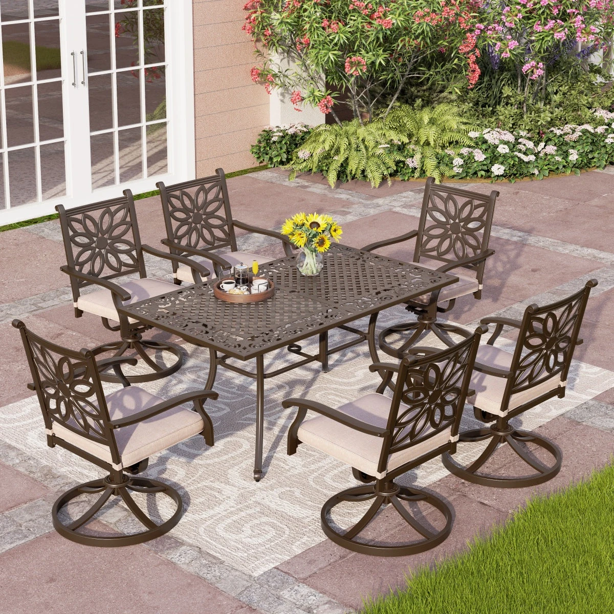 - Weather-resistant: This dining set’s cast aluminum construction resists rust, corrosion, and weather damage, making it perfect for both indoor and outdoor use. It requires minimal maintenance to keep it looking like new.