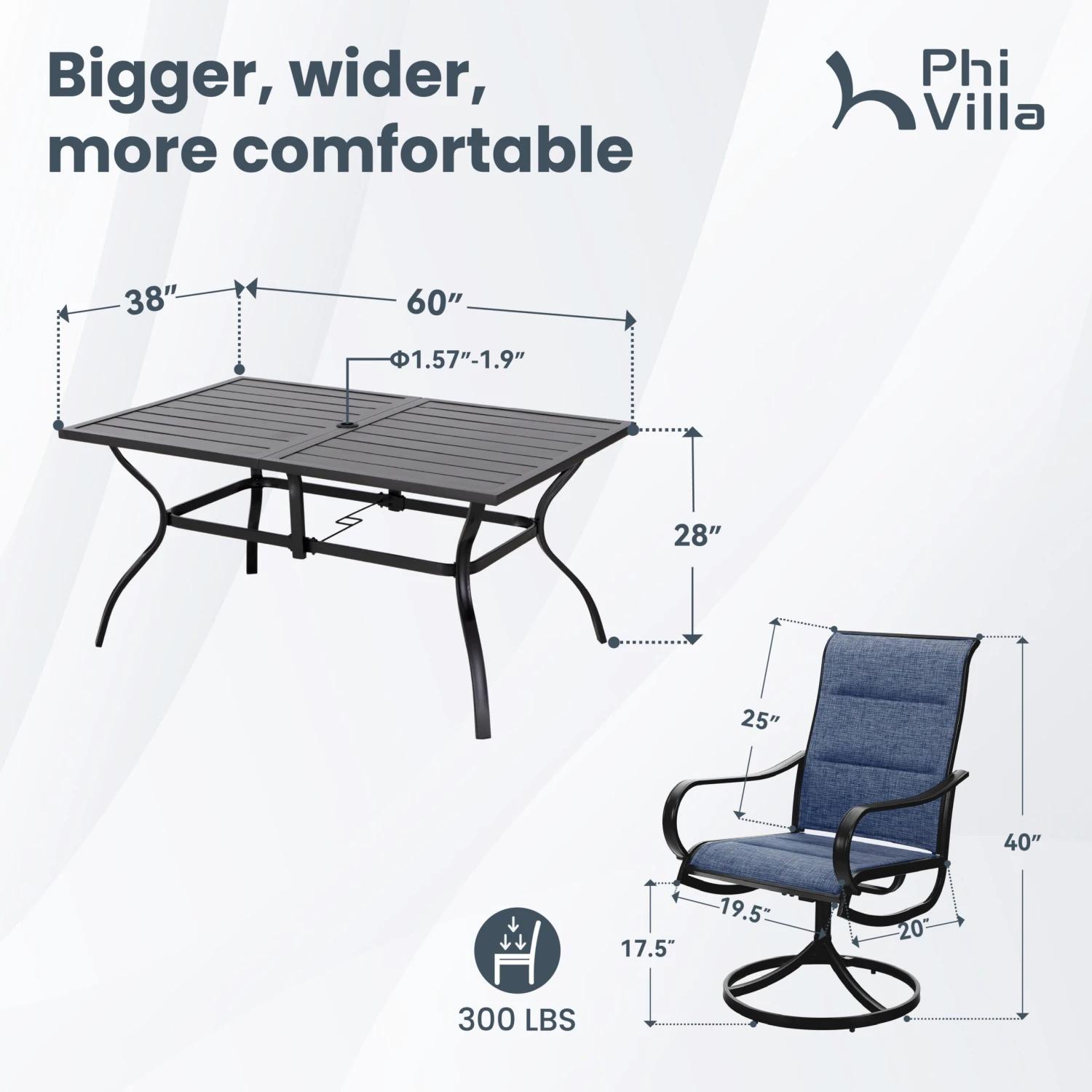 - Table: 60.2″ L x 37.8″ W x 28″ H; Diameter of umbrella hole:1.57″