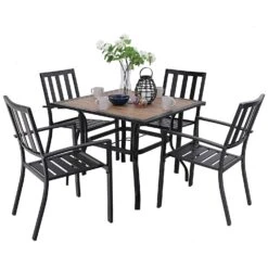PHI VILLA 5-Piece Metal Patio Dining Set Wood-look Table And 4 Pattern Stackable Chairs