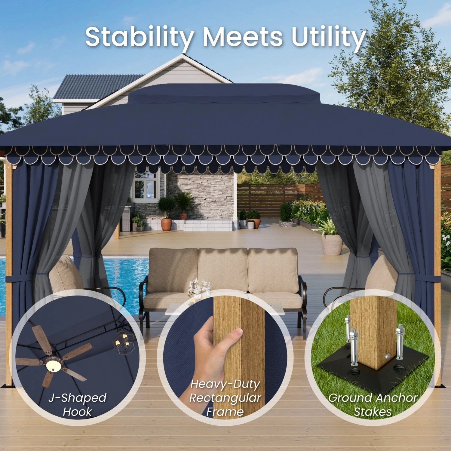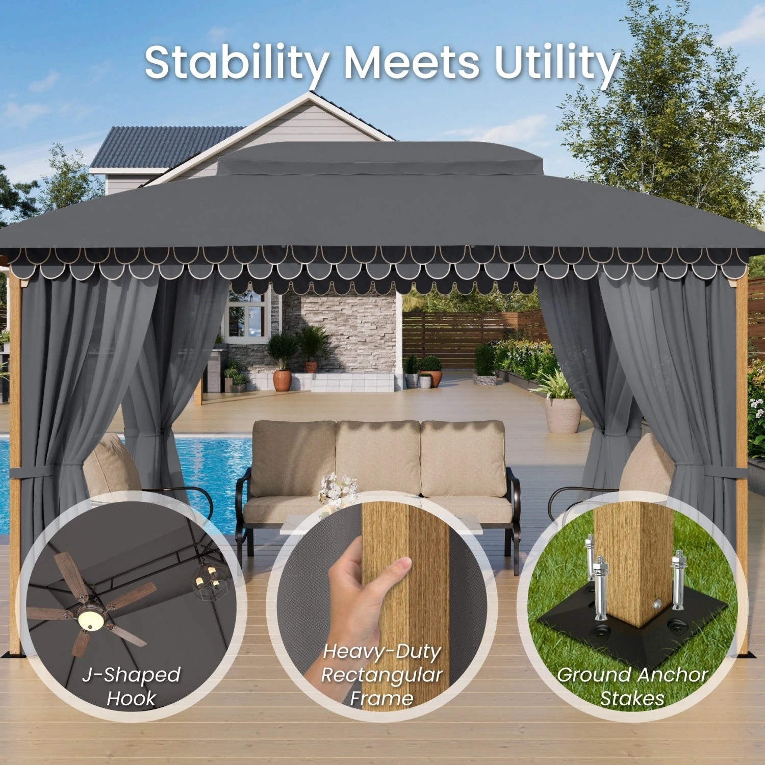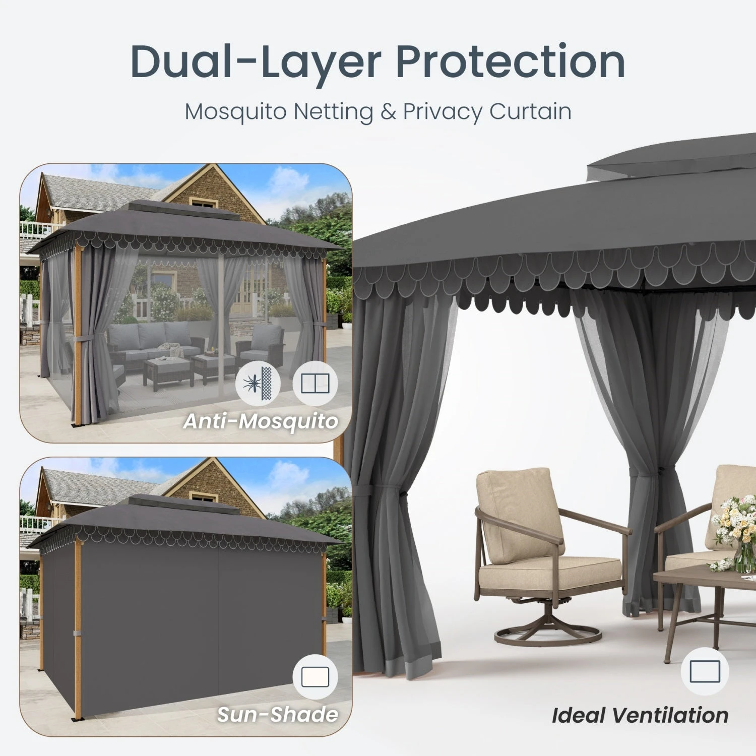 - Dual-Layer Protection: Equipped with mosquito netting and privacy curtains, this gazebo offers dual-layer protection against pesky insects and enhances your outdoor privacy.