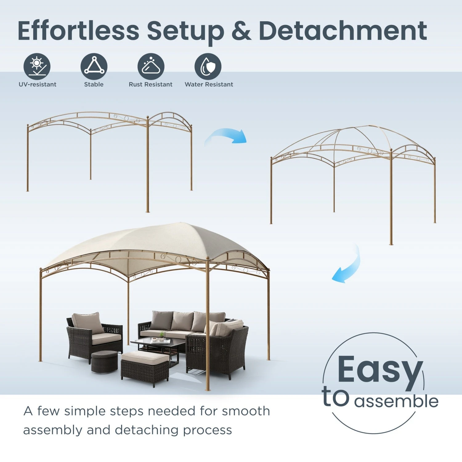 - Effortless Setup & Detachment: Designed for easy assembly, the Gazebo allows for quick setup and takedown in just a few simple steps, maximizing your outdoor enjoyment.