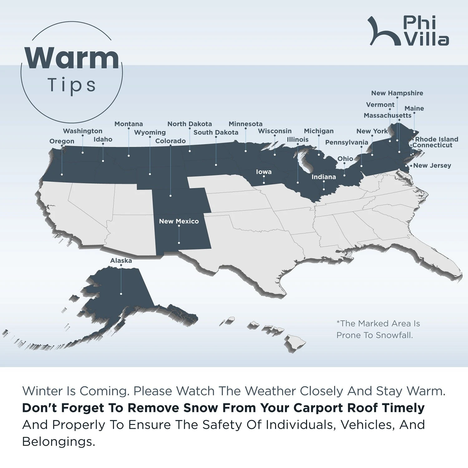 - To ensure that your carport is safe and secure, it is recommended that you clear snow on a reqular basis to avoid the effects of excessive snow on the structure. This not only extends the life of the product, but also keeps your vehicle in good condition at all times.
