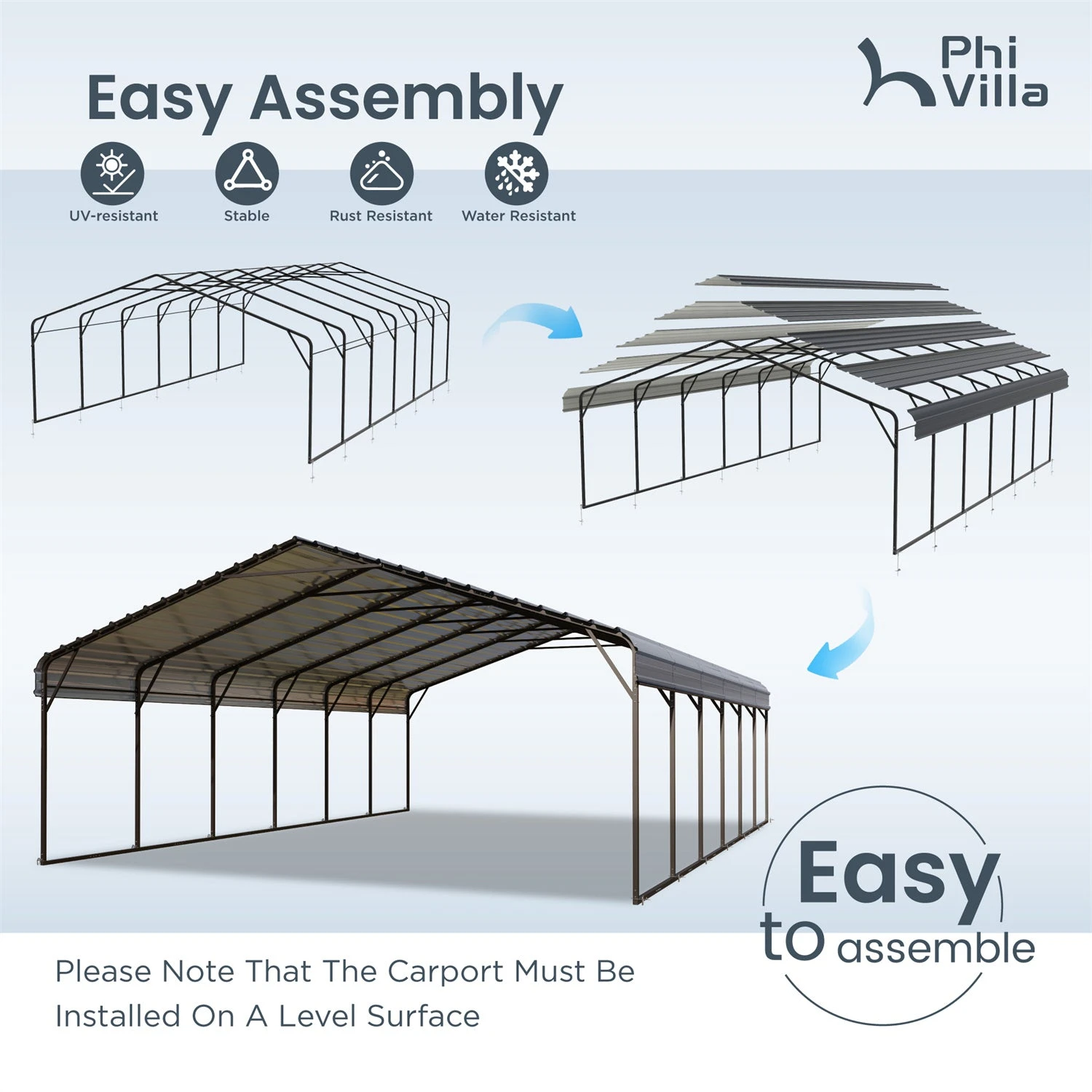 - Easy Installation:Â Featuring simple installation with slip-fit connections and self-drilling screws, setting up this carport is quick and hassle-free.