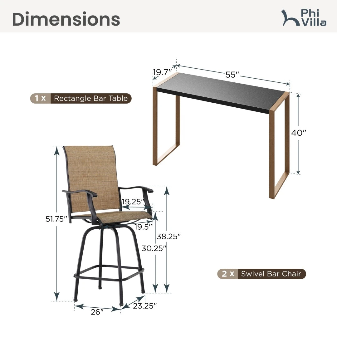 - Bar Stools: 19.5″ W x 19.25″ D x 51.75″ H