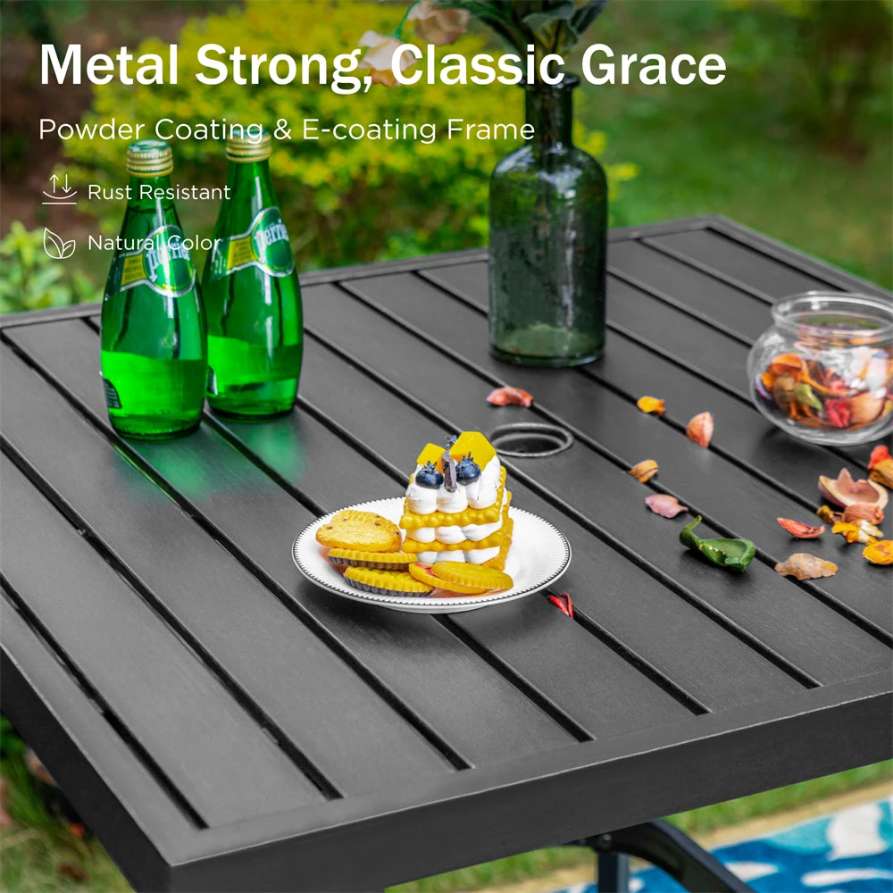 - Sturdy & Durable: Constructed with thick iron and powder coating, the wood grain transfer pattern on the arms adds a stylish touch, making the set fade-resistant. The heavy-duty wrought steel frame is plated with black gold dotted powder coating and is rust- and water-resistant.