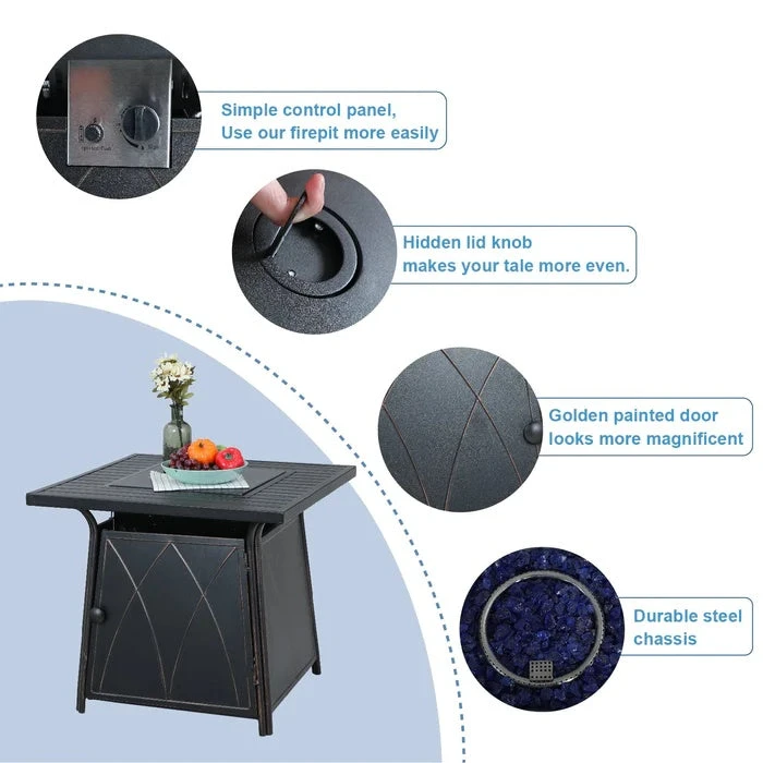 Square Fire Pit Table: 22.5”W x 28.5”D x 25”H