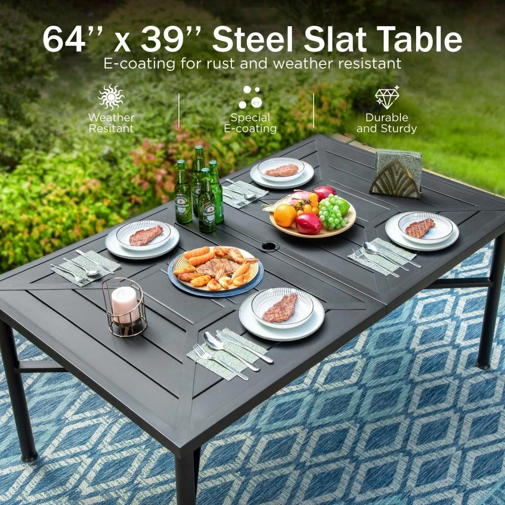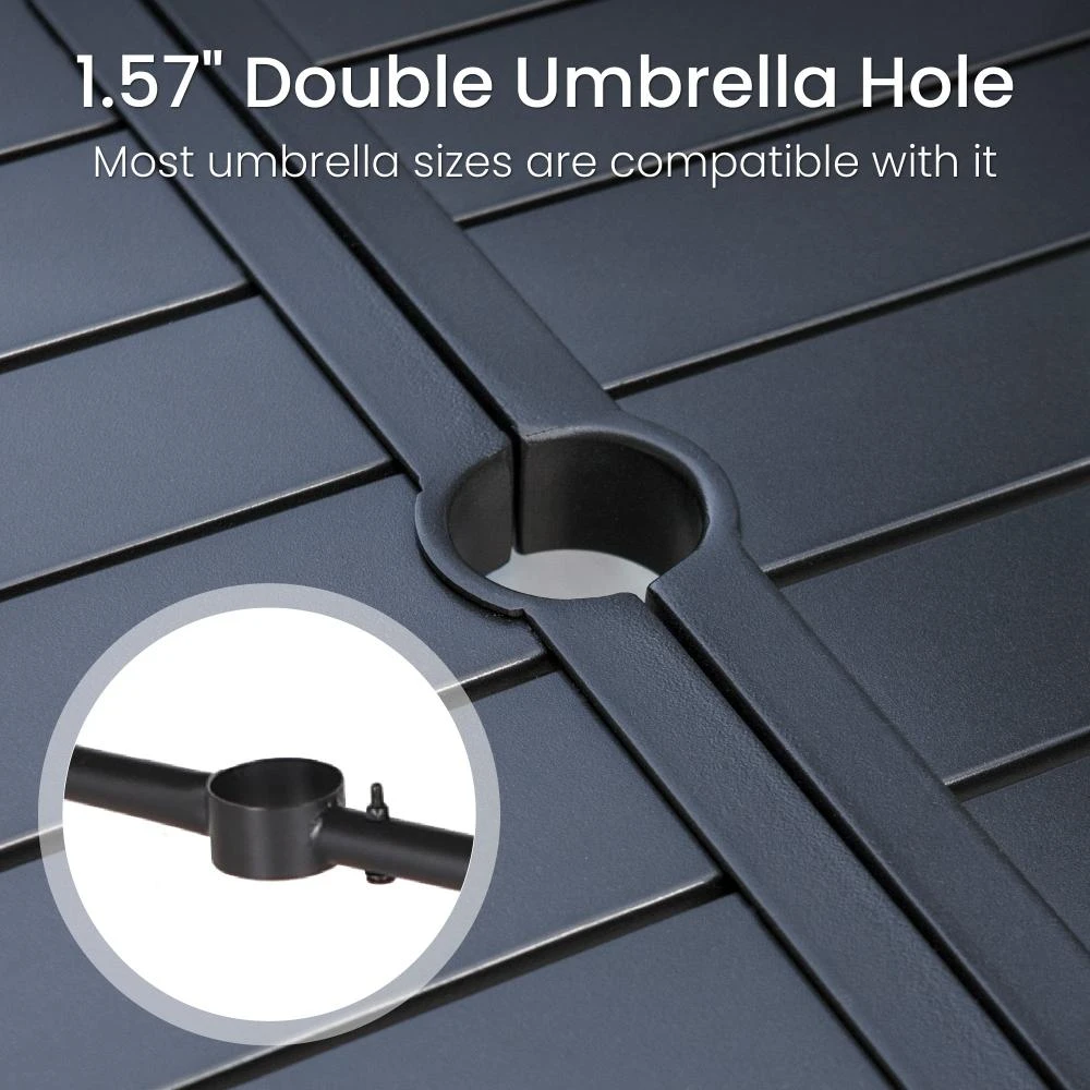 - Regular Table: 67″L x 38″W x 29″H, umbrella hole: 1.97”