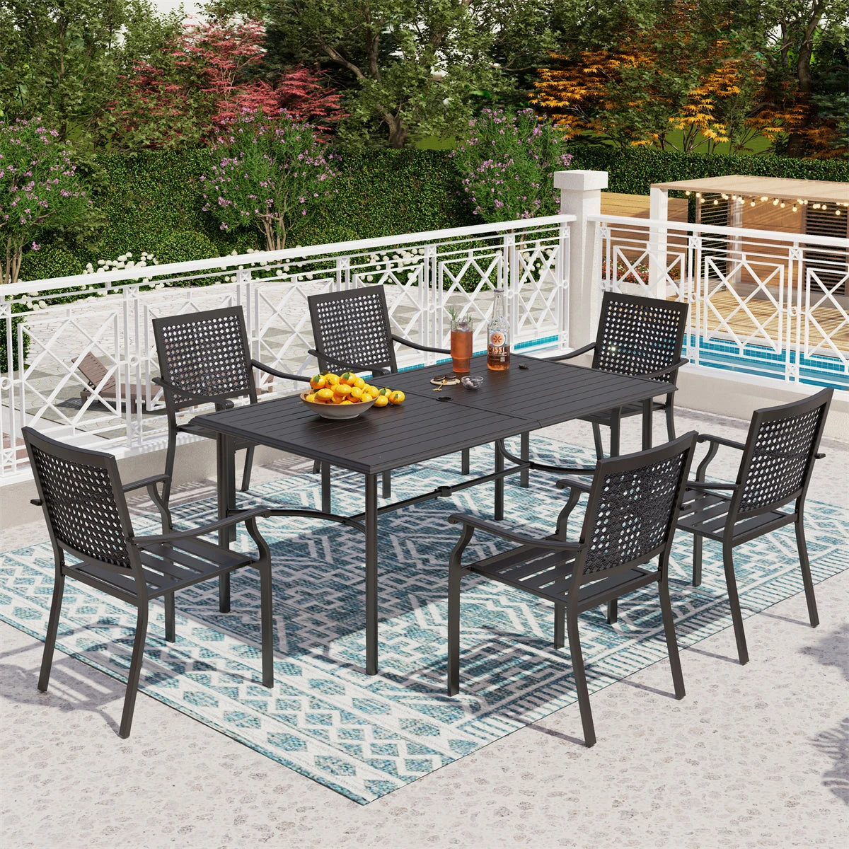 - Patterned Table: 64″ L x 39″ W x 28.5″ H; Diameter of umbrella hole:1.69”