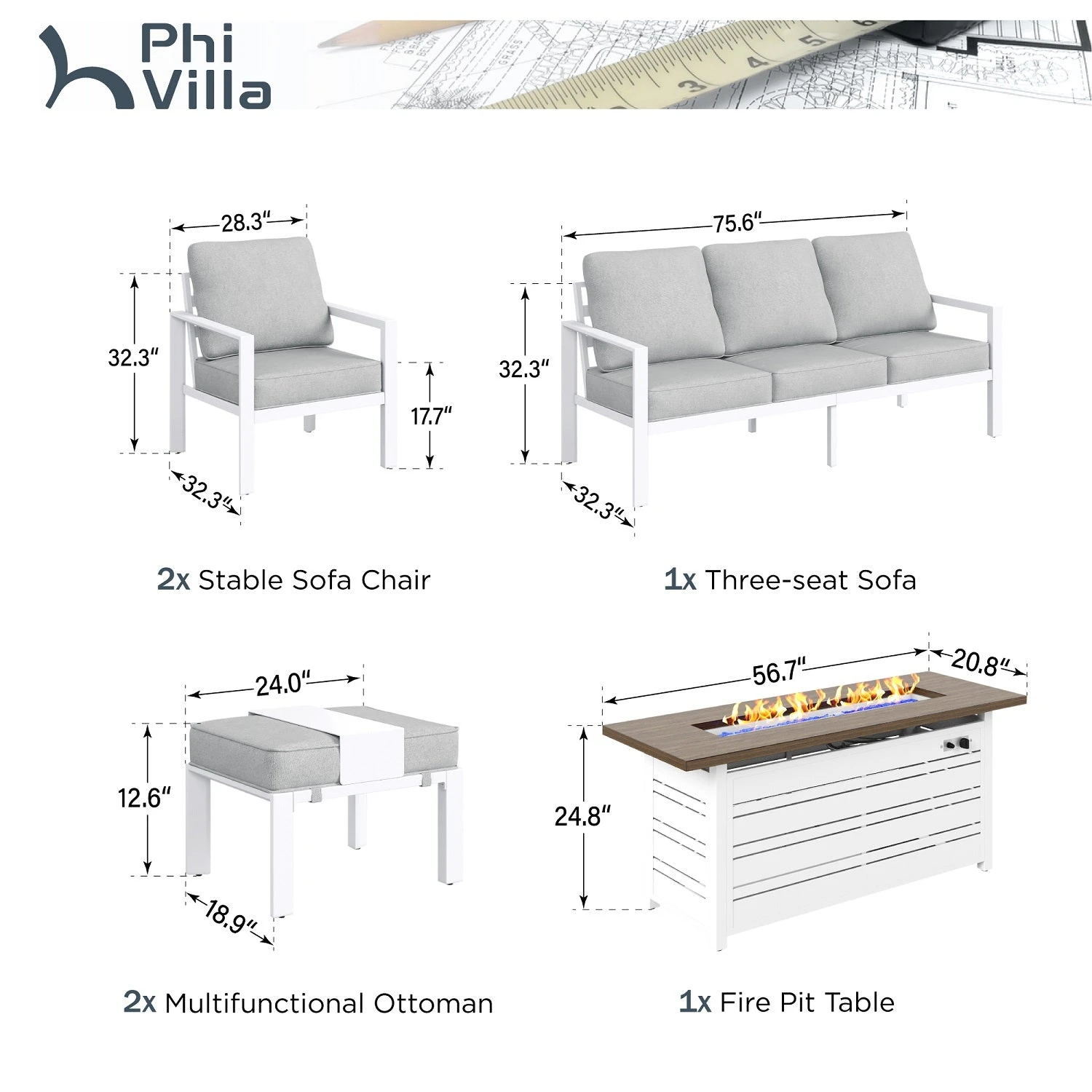 Ottoman: 12.6″H x 24″W x 18.9″D
