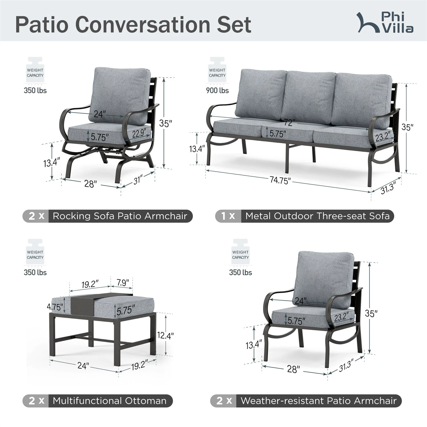 3-Seat Sofa: 74.75”W x 31.3”D x 35”H