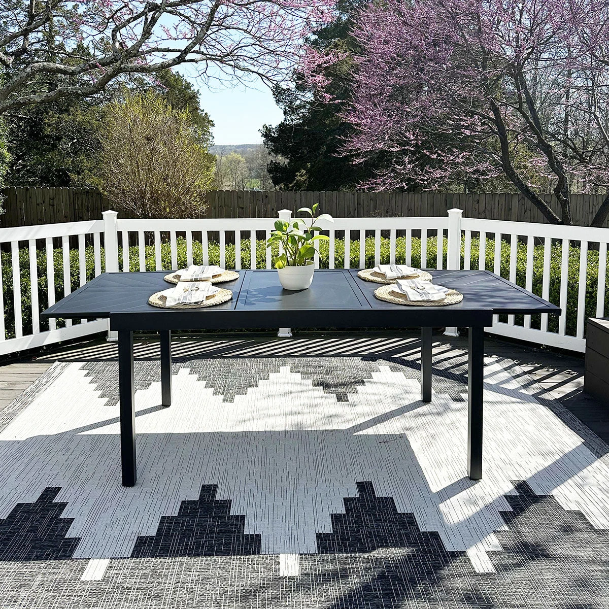 - ⛱️MORDEN EXPANDABLE DESIGN– Large rectangle surface for 6-8 person, enough space for your leisure time with your friends or family. The line carving pattern design of the tabletop is very fashionable and elegant. Expandable table top with 2 sizes (62″ and 84″) meet your actual needs.