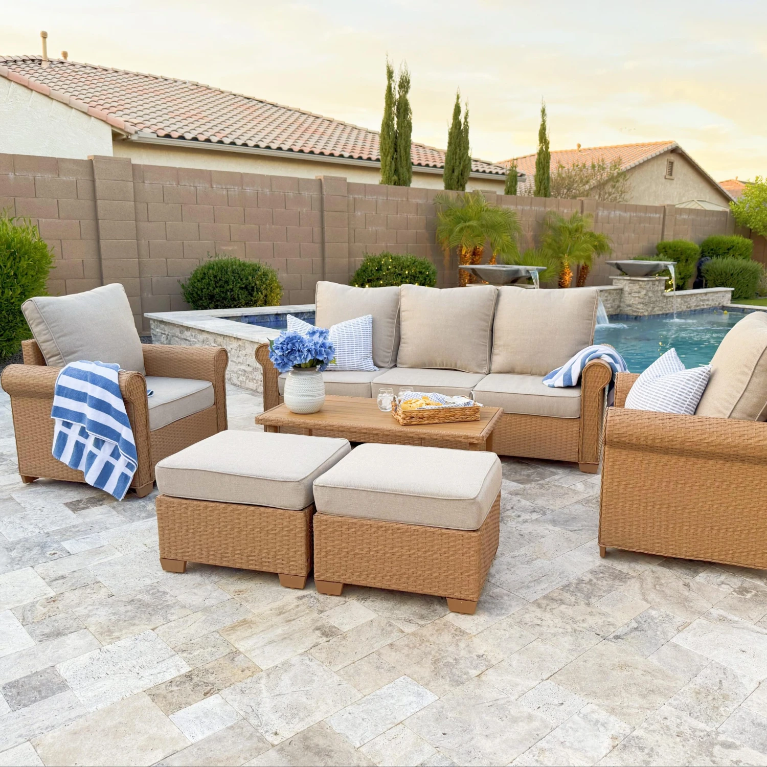 - Premium Design: Experience high-quality design with 5.9’’ widened arched handrails and luxurious three-strand rattan, complemented by 24’’ wide, 5.5’’ thick cushions for relaxation.