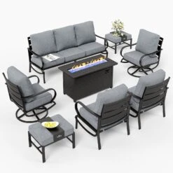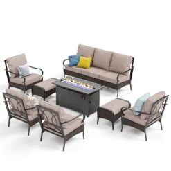 Phi Villa 7-Seater Patio Steel Conversation Sofa Set With Rectangle Fire Pit Table